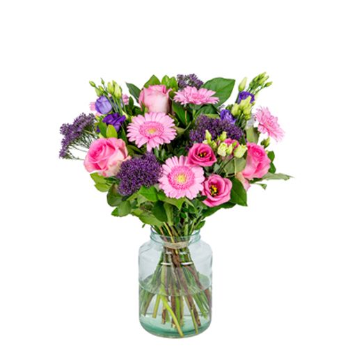 Op zoek naar een cadeau dat meteen een glimlach op het gezicht tovert? Dit roze en paars boeket is een echte eyecatcher. De zachte roze tinten gecombineerd met paarse bloemen zorgen voor een speelse, stijlvolle en warme uitstraling. Perfect om iemand te verrassen, te feliciteren of gewoon te laten weten: ik denk aan je.
